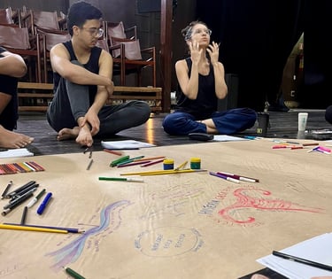 Nessa empreitada ético–estético–afetiva, a criação de um espaço coletivo de respeito, afeto e escuta é a base do nosso trabalho. Risco e descoberta só são possíveis quando esse compromisso é sustentado. É nesse campo que se constrói uma auto-poética: um modo singular de sustentar presença, escuta e linguagem, no qual memória corporal, afeto e relação se transmutam em gesto, palavra, silêncio e ação cênica.
